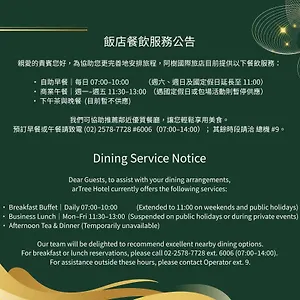 Artree Hotel features a buffet breakfast. Different dishes of Asian cuisine are served at the restaurant. Enjoy Japanese meals in sushi bar ShinYeh Japanese Buffet, set 12 minutes' walk away.